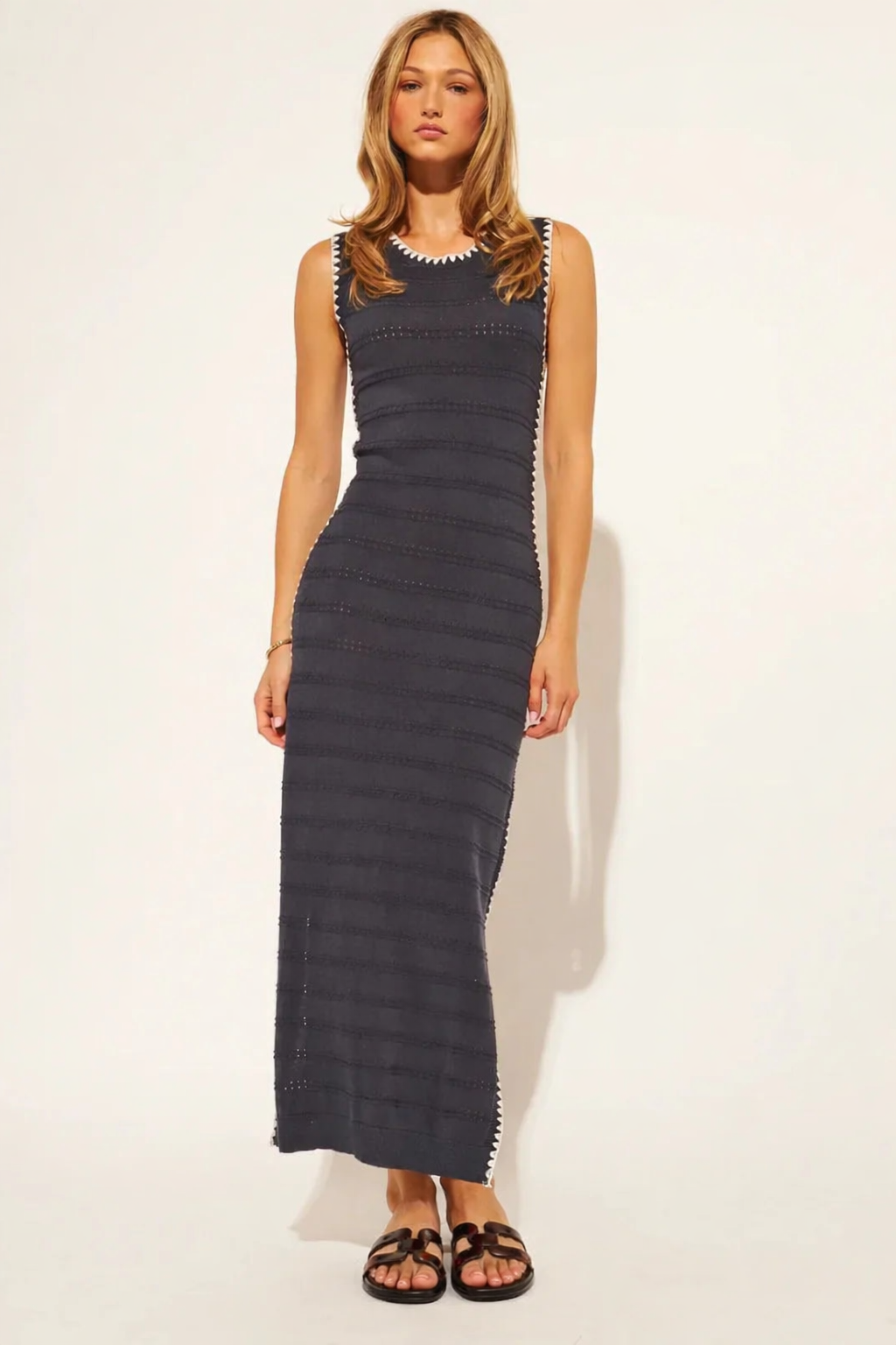 We're seriously crushing on the Amayah Maxi Dress in Navy—and once you slip it on, you'll get why. Made from a super soft knit that hugs your curves just right, it’s got all the dreamy details: a classic crew neckline, flirty side slits, a fitted maxi silhouette, and that chef’s kiss whipstitch trim that adds a pop of fun.