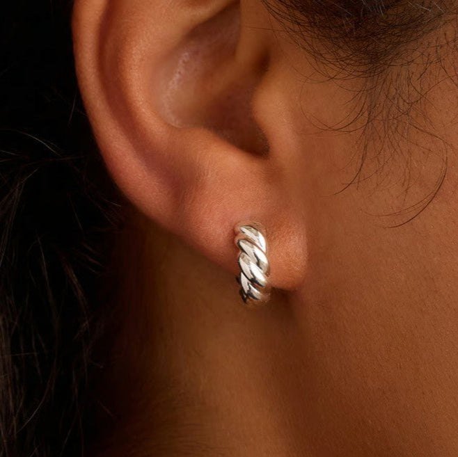 Elevate your style with the Crew Helium Huggies. Featuring a unique twist texture and helium design, these silver plated huggie earrings transition seamlessly from day to night. We love wearing ours alongside silver and diamond studs.