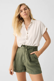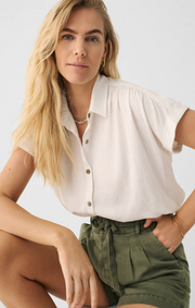 Coconut button front closure, shirring detail at shoulder, shirttail hem with gusset, rolled sleeves.