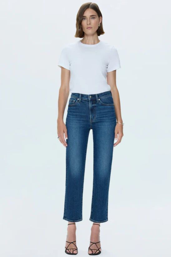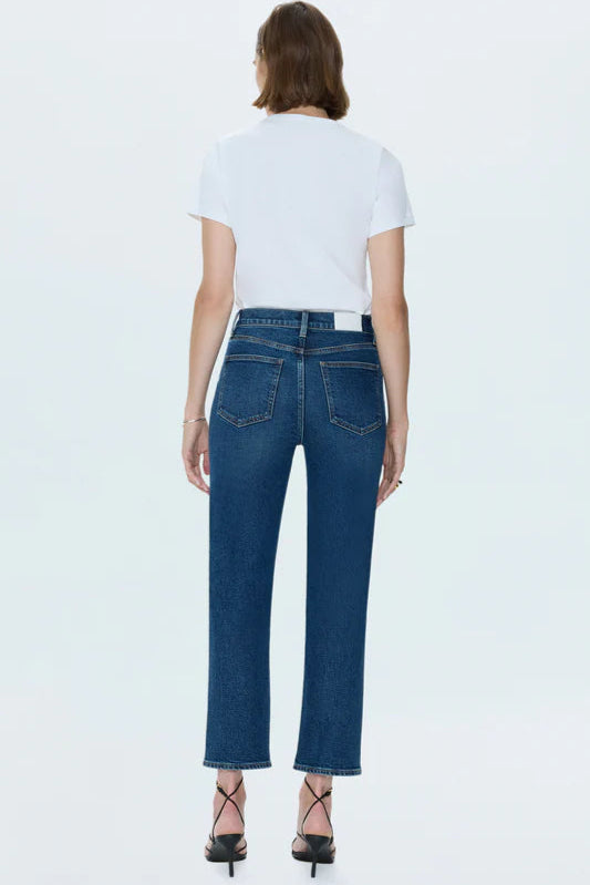The straight leg with no compromise. Charlie hugs at the high-rise waist before falling into a classic straight silhouette and cropped 27" inseam that hits at the perfect ankle length. The clean finished hem brings refined detail to the timeless proportions. Crafted from Pistola's signature comfort stretch denim in Broadway, a dark wash, enhanced by subtle fading and whiskering.