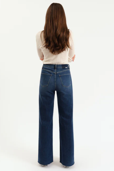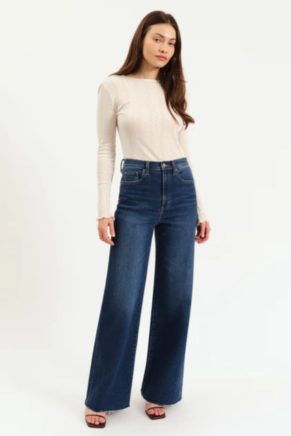 The cool girl jean, Far Out is a modern wide leg silhouette. This dark wash fit is sleek and perfect for fall, and is flexible enough to hug your body, yet heavy enough to cinch you in.