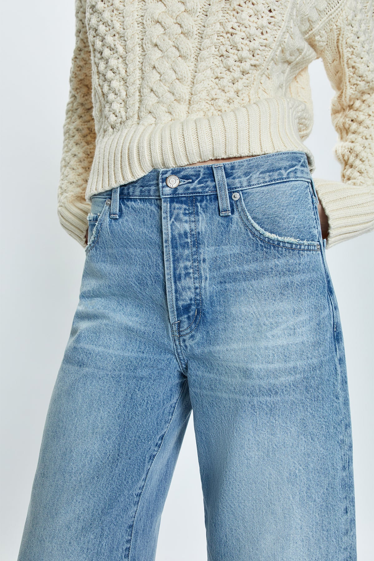 These jeans look amazing on everyone!  High rise waist with a relaxed, straight leg fit and an oversized cuffed ankle hem. Crafted from rigid, lightweight denim without stretch for an expert fit that holds its shape. Essex is a light blue denim wash with vintage fading and whiskering.  Cuff is adjustable.