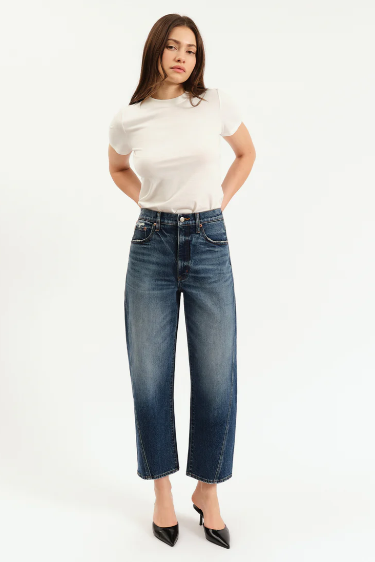 The Westward in Authentic is a high rise jean with a barrel leg silhouette. Featuring a cinched waist, bowed leg, and slightly tapered ankle against a vintage-inspired dark wash, this jean is as versatile as it is flattering. Constructed from our Tough Love fabric, this pair is mostly rigid but yields to your body in all the right ways.