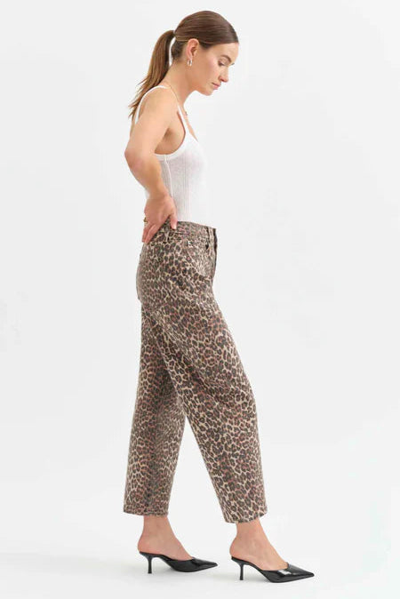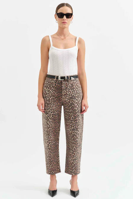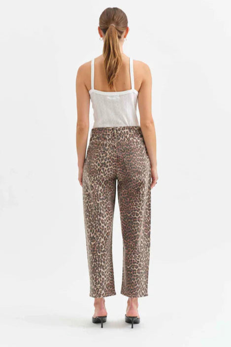 Make a statement in the print of the season. The Westward in Cool Cat is a high rise jean with a trending barrel leg silhouette and a tan and black cheetah inspired print. Featuring a cinched waist, bowed leg, and slightly tapered ankle.