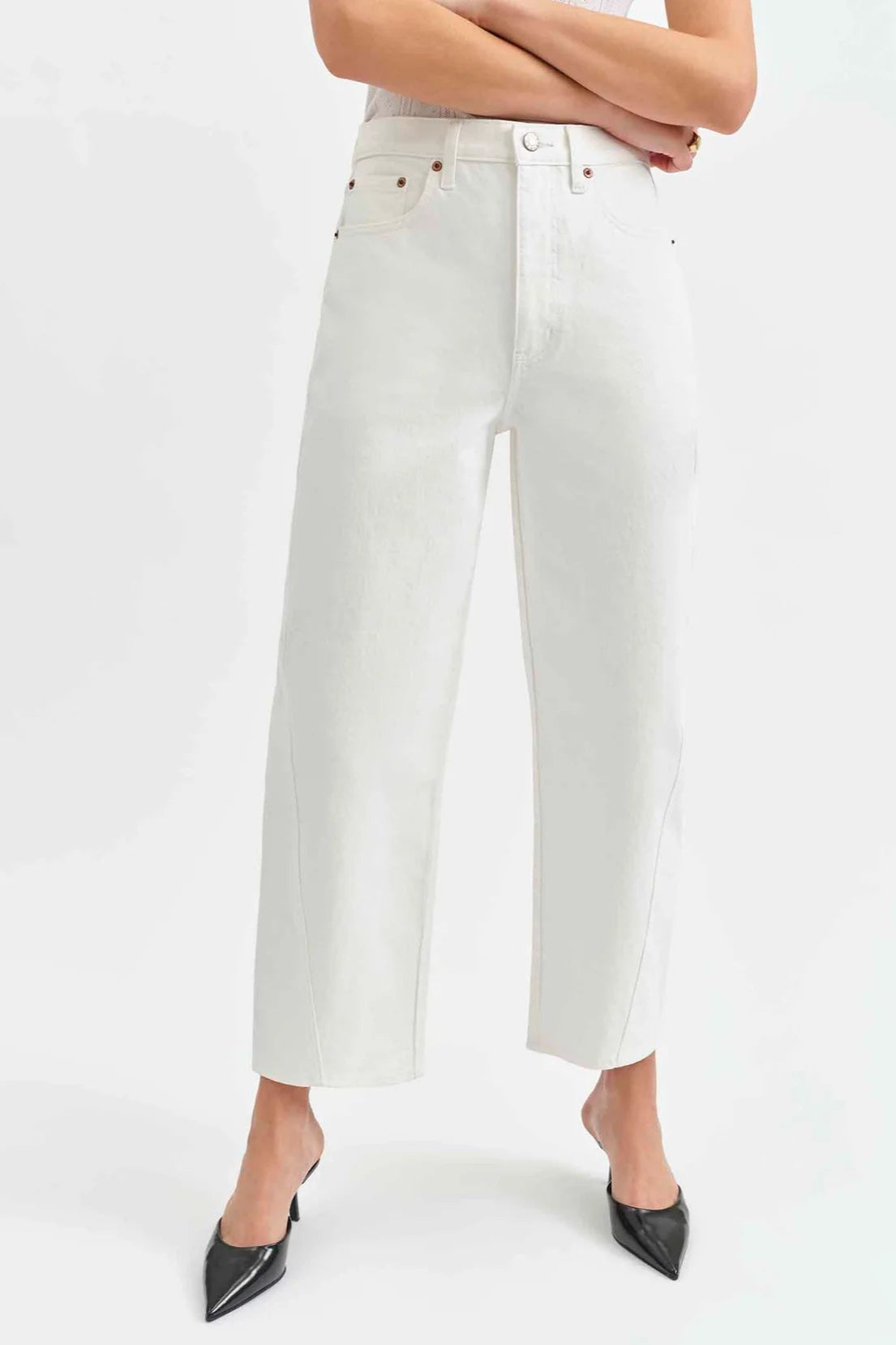 Everyone's favorite boyfriend barrel is back in white swan!  A high rise jean with a slight barrel leg silhouette. Featuring a cinched waist, bowed leg, and slightly tapered ankle against a timeless light wash, this jean is as versatile as it is flattering.  So fun to style for spring and summer!