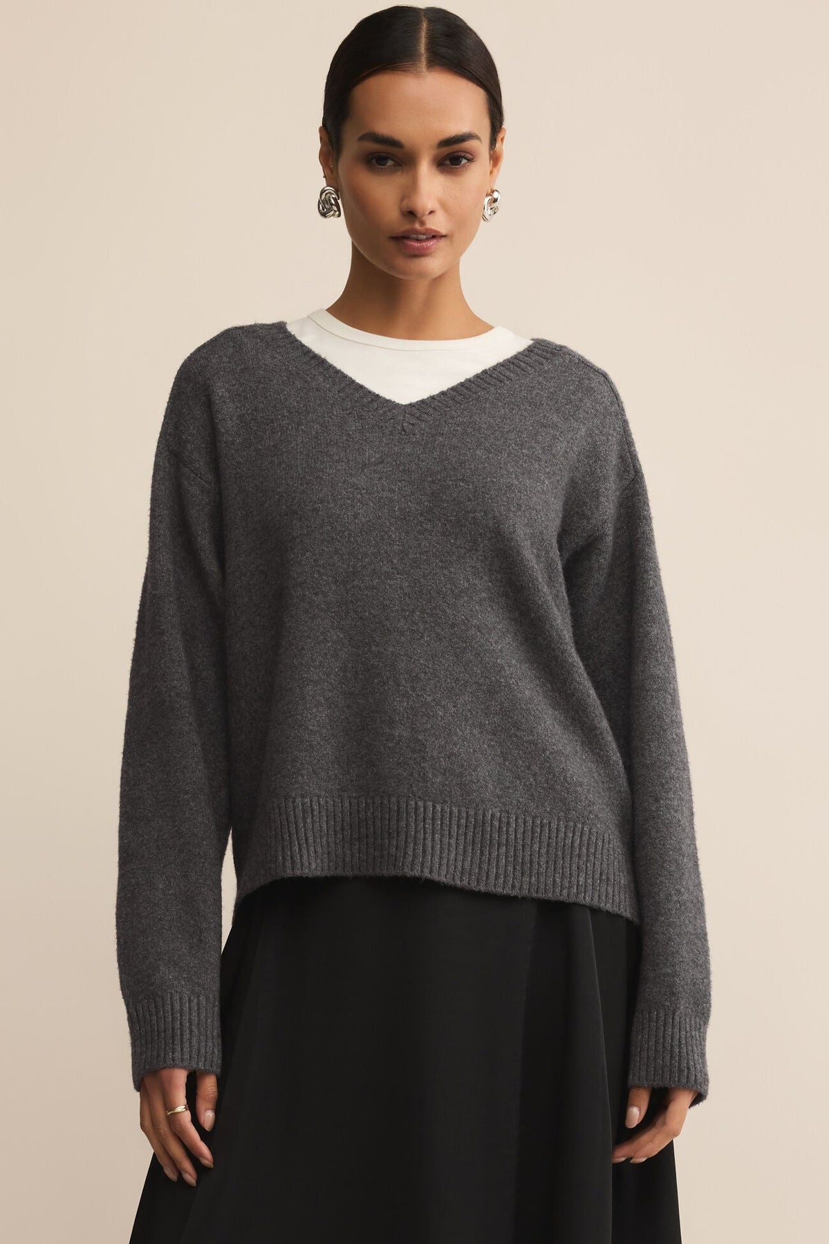 The Eloise Sweater in Charcoal Heather is your new cozy BFF. This soft, mid-weight V-neck keeps things relaxed and stylish with a slightly cropped fit and ribbed edges. Perfect for layering over jeans or skirts, it adds a cool, casual vibe to any outfit. Easy to wear, easy to love!