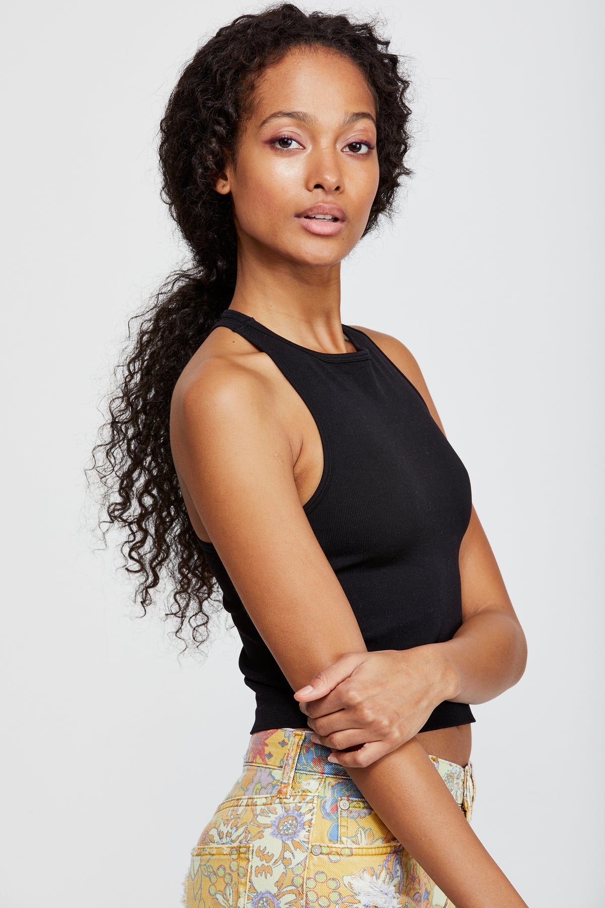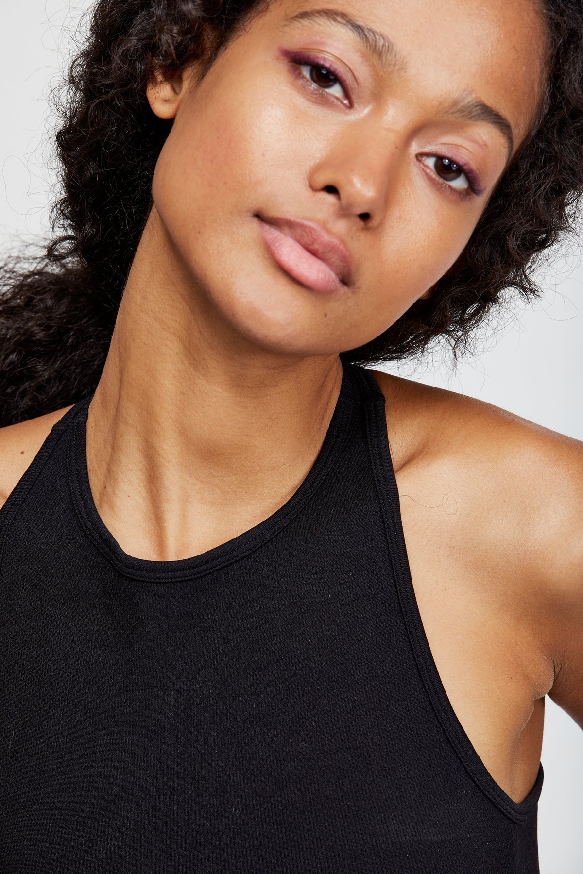 Essential racerback cami featuring a form fitting ribbed design with a slightly cropped silhouette.  High neck and stretch fit.