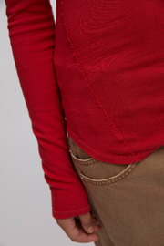 Features: Soft cotton fabrication, off-the-shoulder style with folded neckline detail, fitted long-sleeves, exposed seam detailing