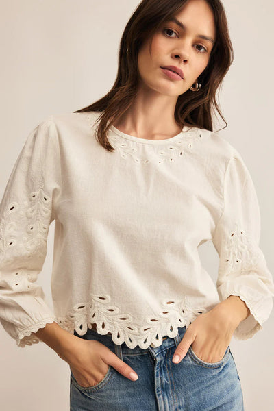 This embroidered top features a chic design and is effortlessly cool. With eyelet embroidery along the sleeves and hem, this relaxed cotton-linen long sleeve has a laid-back feel with just the right amount of polish.  We love this paired back to our favorite denim for an effortless date night.  Also pairs with the Pesaro Linen Shorts