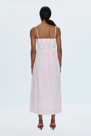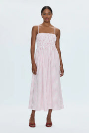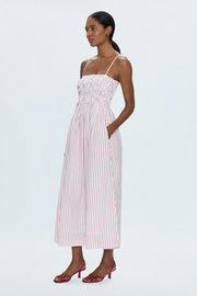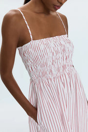 Sweet treat. Breezy day dress crafted from a flowing, lightweight fabrication designed for warm weather wear. Smocked bodice with ruched design details, topped with adjustable shoulder straps.  White base with candy red stripes.  And she has pockets!