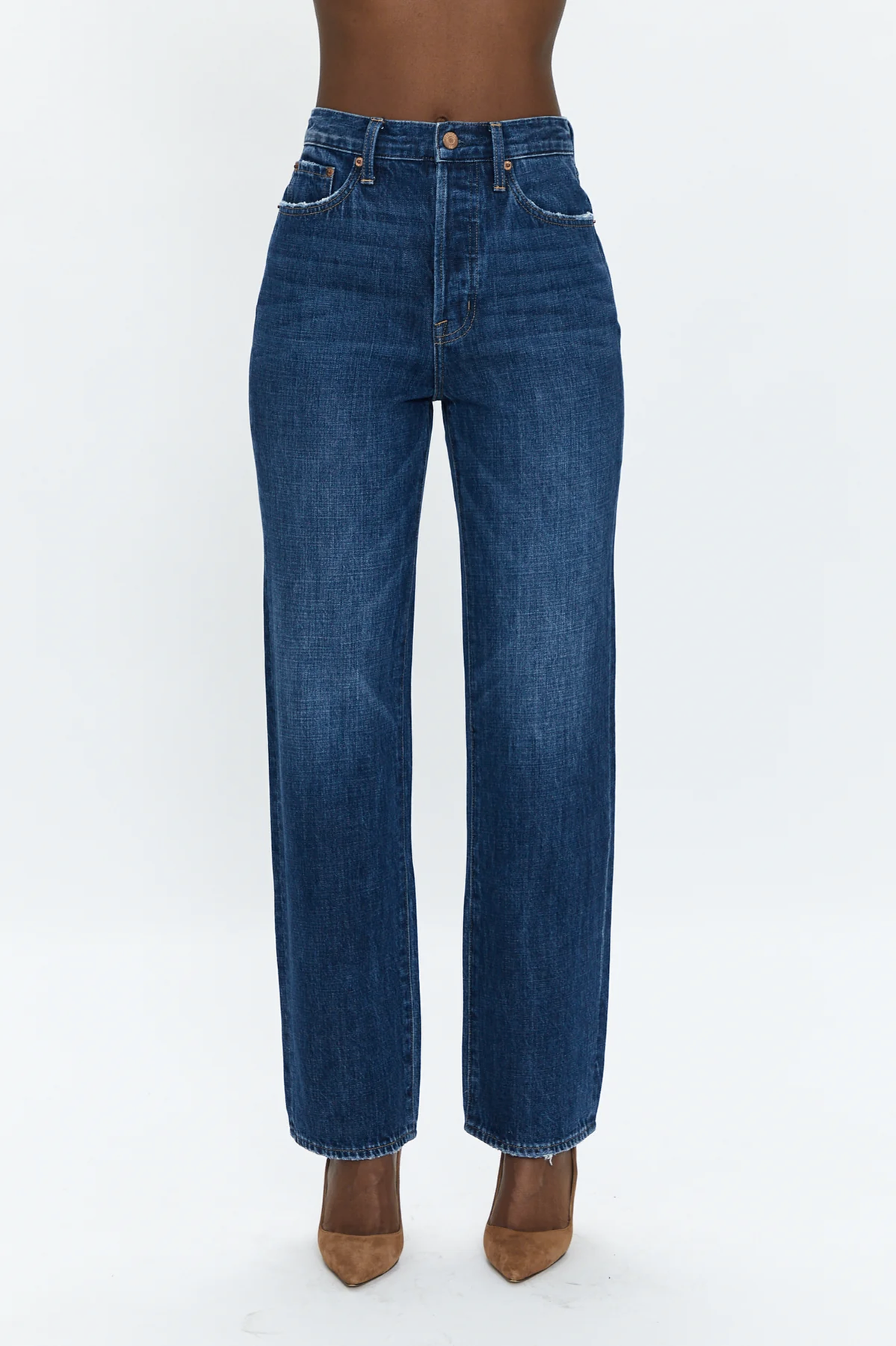 Embrace your figure with this super high rise version of the Cassie that pinches your waist and makes your legs look longer. In a clean and timeless dark wash with a slimming button fly, it has slight fraying on the ankles and pockets to make it seem like a lovingly worn-in vintage piece. Wear yours with anything from a long sleeve bodysuit to a striped button down.