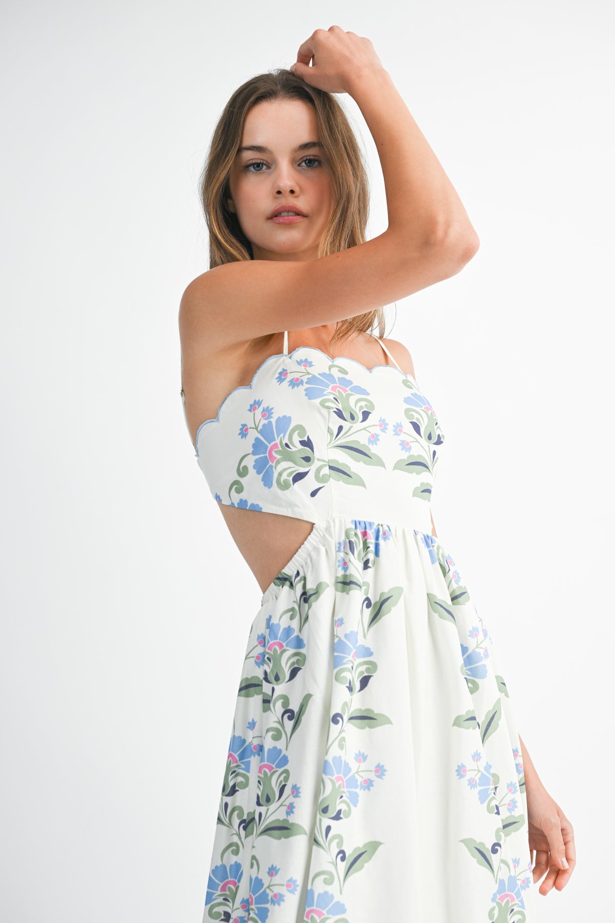 Dress up with a touch of whimsy in this midi that balances romance with edge. The floral border print and scalloped neckline whisper elegance, while strategic cut-outs at the sides and back add a modern twist. Adjustable spaghetti straps and and the back elastic band ensure a personalized fit.  Fully lined for comfort and confidence, this dress is  perfect whether you are heading to a garden soirée or a casual weekend outing.