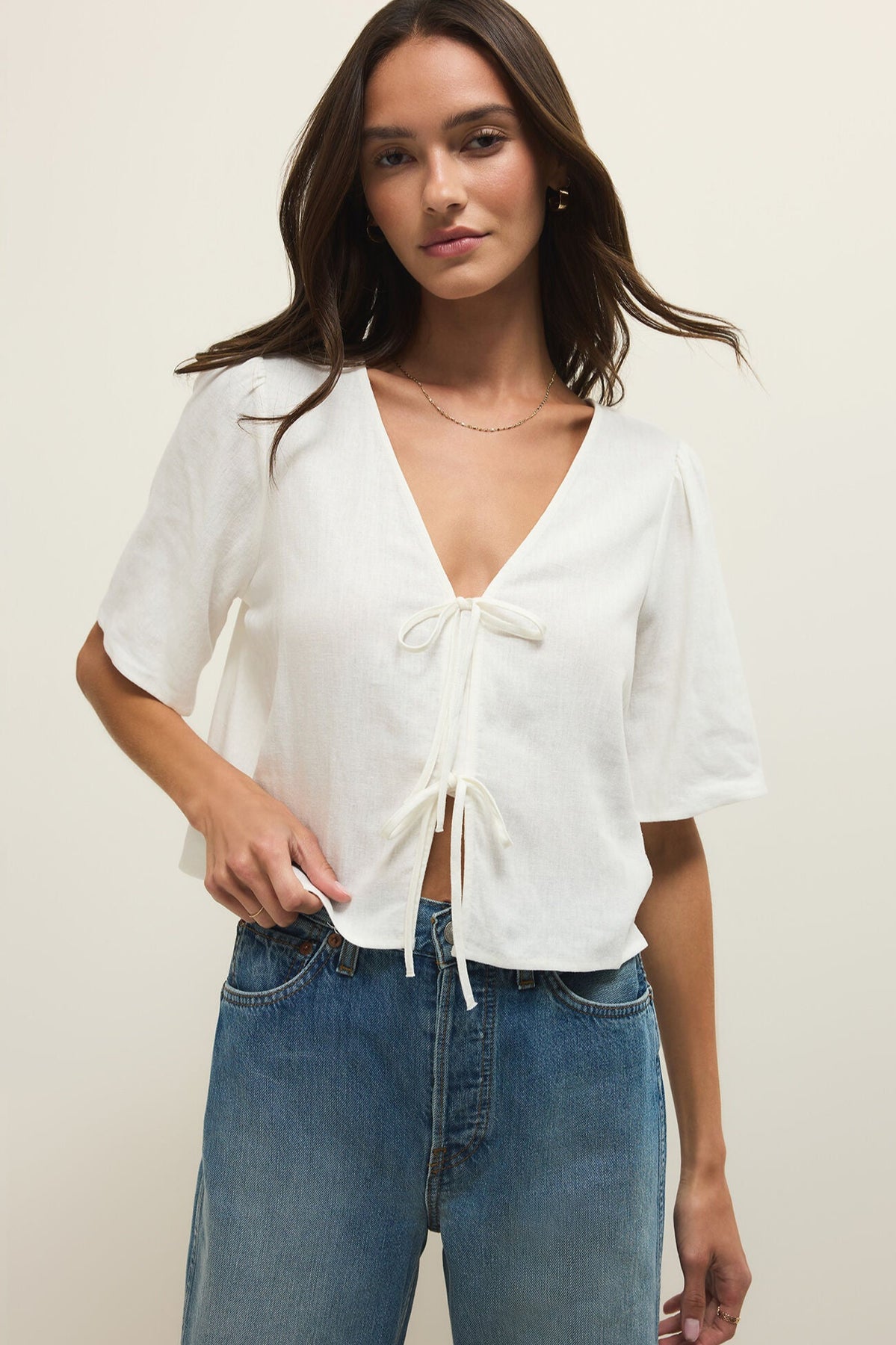 This feminine top is an instant favorite with its washed linen blend fabric, flattering relaxed fit, and tie front, finished with a modesty placket for easy coverage. Made to be dressed up or down, try it with denim or our Scout linen pants