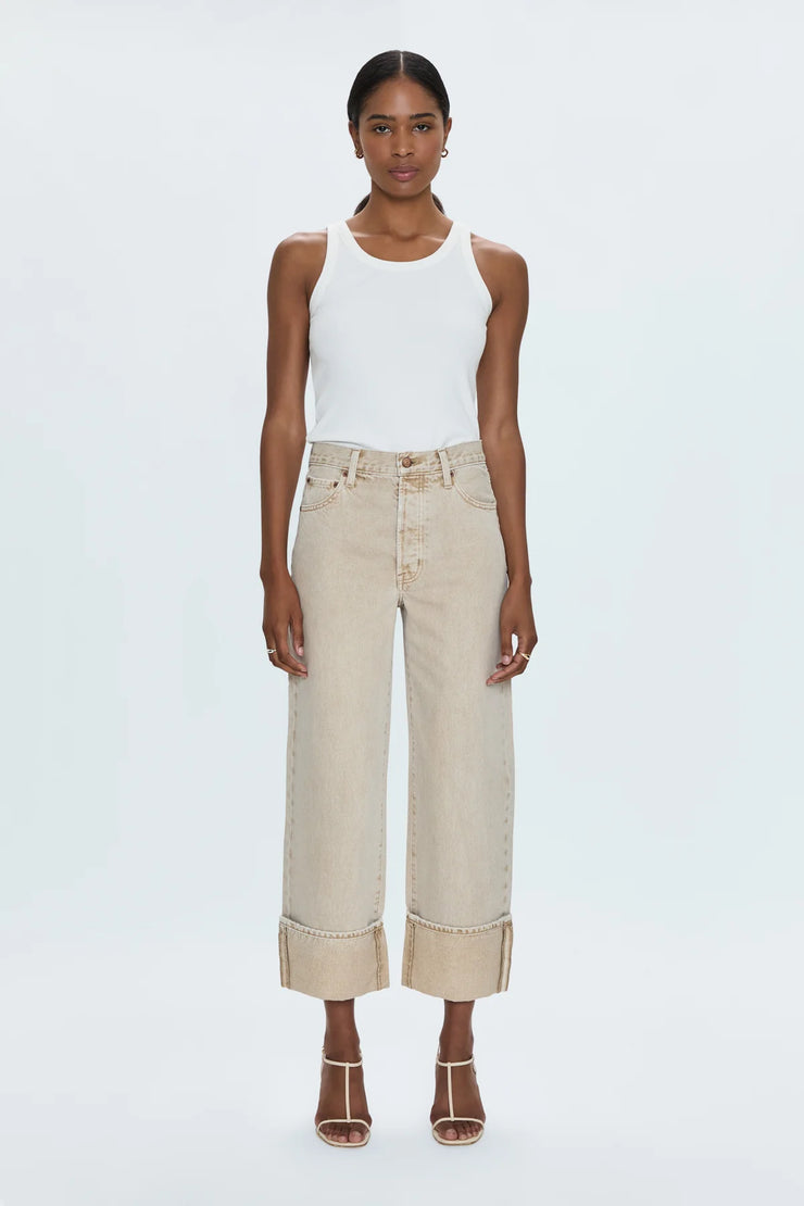 High-Rise Wide Leg Jeans in Oat. Meet your new favorite jeans. These high-rise jeans feature a relaxed, wide-leg fit, an oversized cuffed ankle hem, and are crafted from rigid, lightweight denim for a vintage-inspired look and feel.