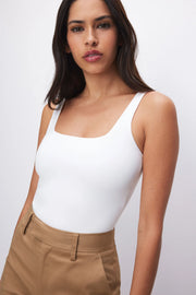 The curve-hugging, shape-enhancing, confidence boosting essential for every wardrobe. The Scuba Modern Tank Bodysuit is made with Good American's luxurious compressive fabric, designed to smooth and sculpt your curves. Wear this with your favorite pair of jeans on the daily, or dress it up with pants and skirts.
